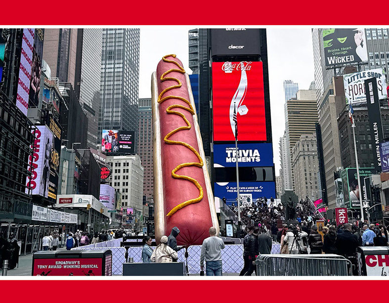 به گزارش روابط عمومی انجمن صنایع گوشتی ایران، میدان تایمز شاهد یک هات داگ به طول 65 فوت است که با یک نان بزرگ، سوسیس فرانکفورت و سس خردل تشکیل شده است که هر روز عصر، یک بالابر هیدرولیک این هات داگ غولپیکر را بالا میبرد تا به نمایش همگان گذاشته شود.
