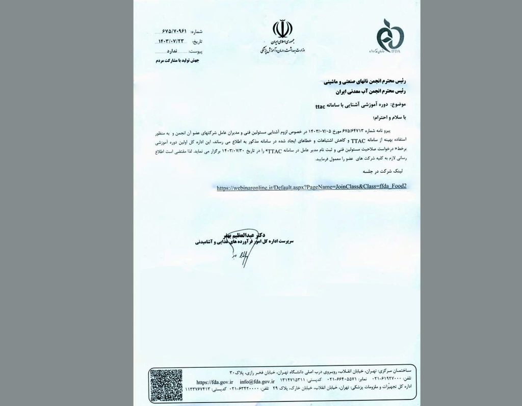اولین دوره آموزشی برخط درخواست صلاحیت مسئولان فنی و ثبت نام مدیرعامل در سامانه TTAC، سیام مهرماه امسال توسط ادارهکل امور فرآوردههای غذایی و آشامیدنی وزارت بهداشت، درمان و آموزش پزشکی برگزار میشود.