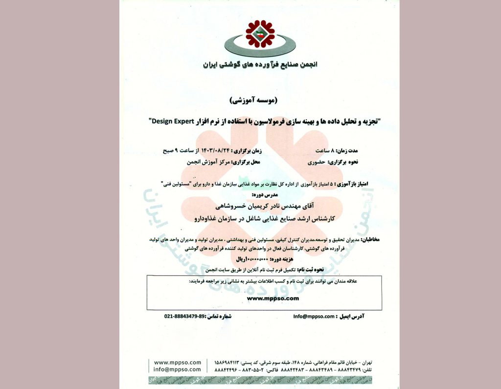 دوره آموزشی تجزیه و تحلیل دادهها و بهینهسازی فرمولاسیون با استفاده از نرمافزارDesign Expert پنجشنبه 24 آبانماه برگزار میشود.