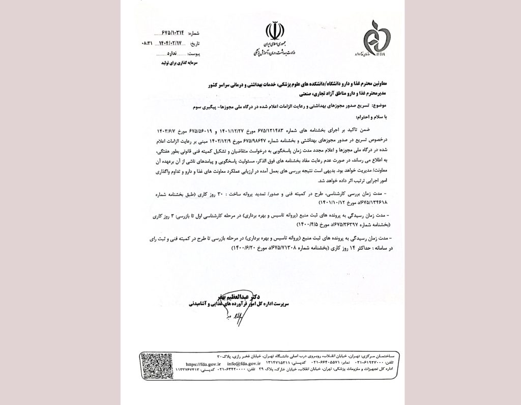 «ضمن تأکید بر اجرای بخشنامه‌های ‌شماره 121483 / 675 مورخ 27 / 12 / 1404 و 56019 / 675 مورخ 7 / 6 /1403 درخصوص تسریع در صدور مجوزهای بهداشتی و بخشنامه شماره 98647 / 675 مورخ 9 / 12/ 1402 مبنی بر رعایت الزامات اعلام شده در درگاه ملی مجوزها و اعلام مجدد مدت زمان پاسخگویی به درخواست متقاضیان و تشکیل کمیته فنی قانونی به‌طور هفتگی، به اطلاع می‌رساند، درصورت عدم رعایت مفاد بخشنامه‌های فوق‌الذکر، مسؤولیت پاسخگویی و پیامدهای ناشی از آن برعهده آن معاونت / مدیریت خواهد بود.