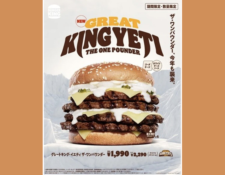 به گزارش خبرنگار ما، امسال برگرکینگ ژاپن این برگر را که حاوی سس مایونز جدیدی نیز است عرضه کرده است تا هم طعم بهتری داشته باشد و هم کالری را افزایش دهد. علاقهمندان به این برگر اعلام کردند که این آیتم تازه وارد به منوی «برگرکینگ» خوشمزه ترین چیزی است که تا به حال در برگر کینگ امتحان کردهاند. همچنین مشتریان اعلام کردند که قیمت این ساندویچ گران است، اما به دلیل طعم و تجربه ارزش امتحان کردن را دارد. همچنین لازم به ذکر است که «برگرکینگ ژاپن» اعلام کرد: «یتی برگر» در زمان محدودی در «برگرکینگ ژاپن» موجود خواهد بود.