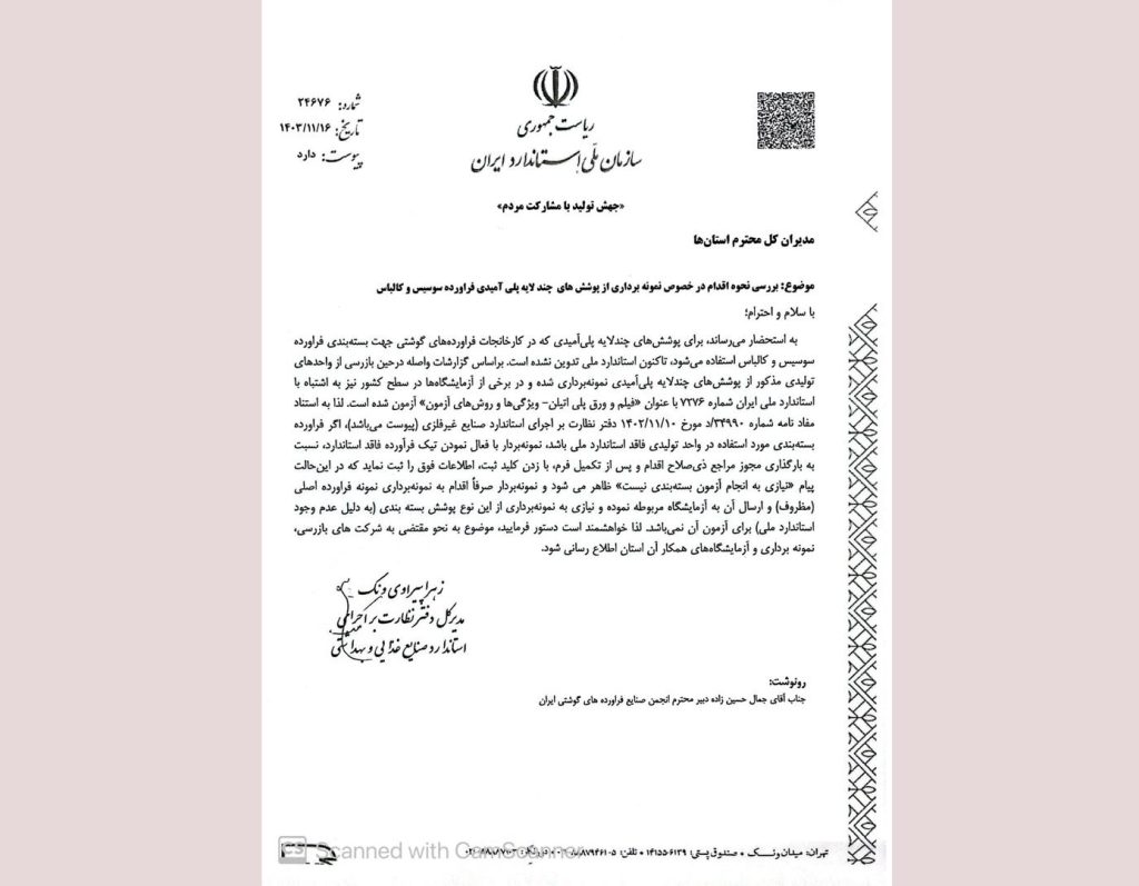 به گزارش روابط عمومی انجمن صنایع فرآورده های گوشتی ایران، زهرا پیراوی ونک، مدیرکل دفتر نظارت بر اجرای استاندارد و صنایع غذایی و بهداشتی سازمان ملی استاندارد ایران در رابطه با بررسی نحوه اقدام در خصوص نمونه برداری از پوشش های چند لایه پلیآمیدی فرآورده سوسیس و کالباس، با ارسال نامه ای به مدیران کل استان ها عنوان کرد که برای پوششهای چندلایه پلیآمیدی که در کارخانجات فرآوردههای گوشتی جهت بستهبندی فرآورده سوسیس و کالباس استفاده میشود، تاکنون استاندارد ملی تدوین نشده است.